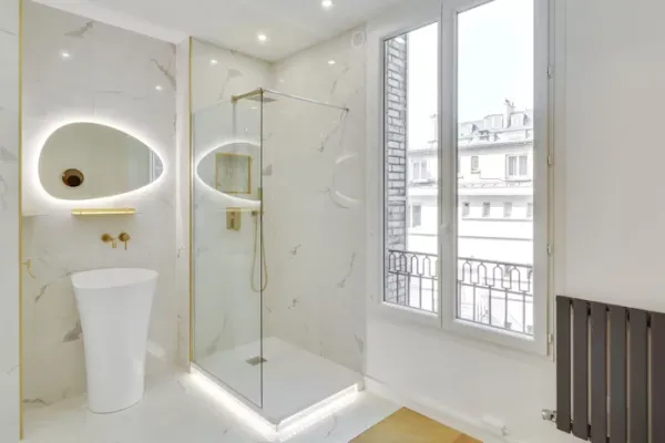 Le choix de la douche et l’organisation globale d’une salle de bain se pensent avec minutie. En effet les positionnements de la vasque, du receveur, du sèche-serviette sont importants pour que vous circuliez avec aisance.